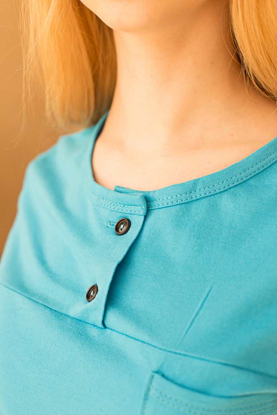 Модная и удобная хлопковая футболка ярко-голубого цвета с горловиной на пуговицах. С коротким рукавом.